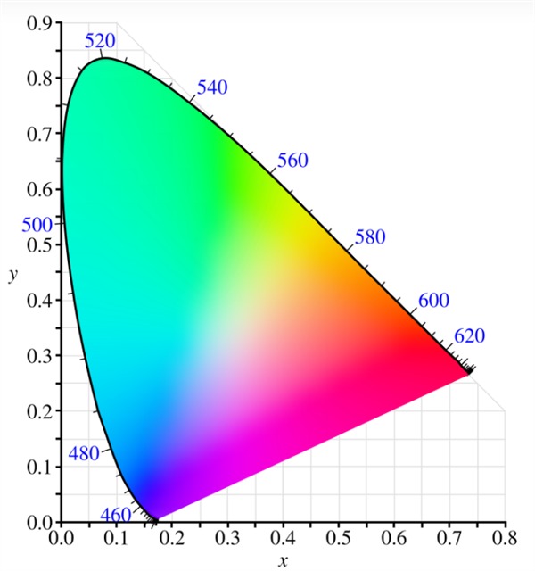 CIE1931的颜色空间是基于对视觉色觉的简单研究,只考虑了亮度因素,而忽略了颜色的明度变化。因此,它的色度图是一个二维平面。