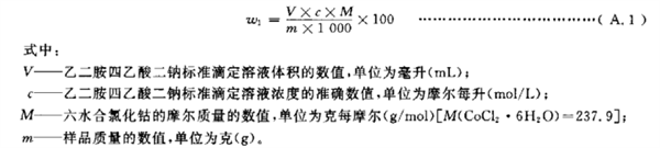 六水合氯化钴的质量分数w,数值以“%”表示,按式(A.1)计算: