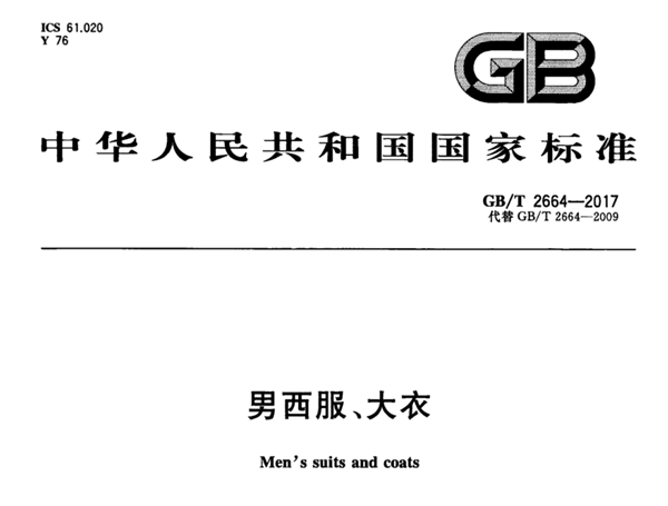 1.. GB/T 2664-2009 男西服、大衣标准: